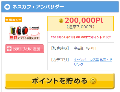 ゲットマネーでネスカフェアンバサダーが200,000pt(20,000円相当)に緊急ポイントUP